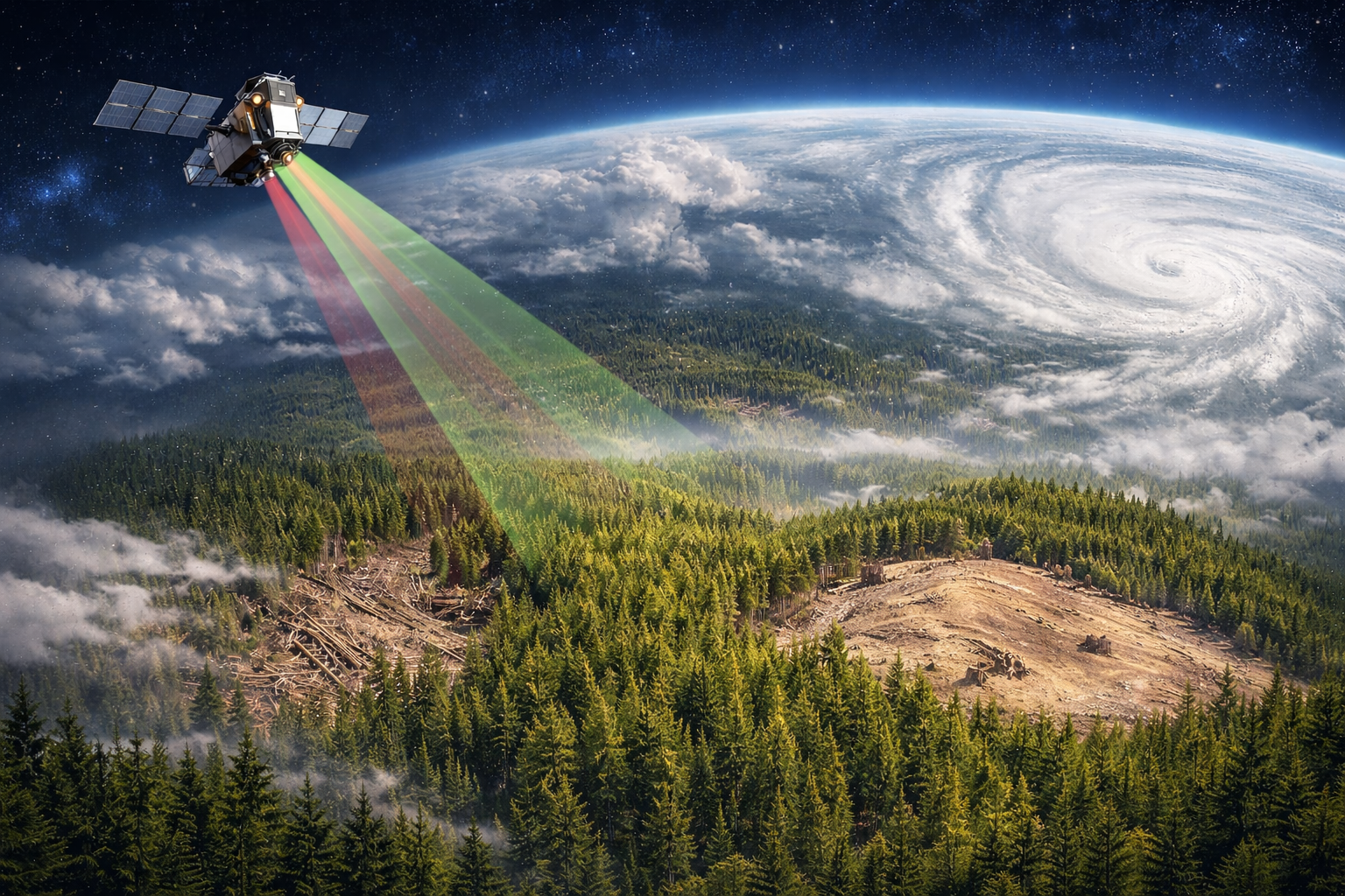 NDVI-Signatur gegen 5-Jahres-Baseline auf deiner Nadelwald-Maske. Veränderungen Wochen vor sichtbarem Schaden.